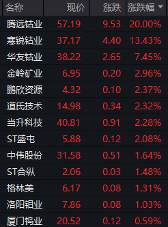 6月23日A股早盘,钴矿板块异军突起,成为市场焦点。截至发稿,钴矿板块整体涨幅3.9%,多只个股表现亮眼。腾远钴业20CM涨停,寒锐钴业涨超13%,华友钴业涨超7%,金岭矿业、鹏欣资源、道氏技术、当升科技等跟涨。