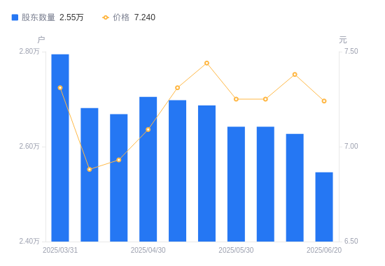 日期A股户数(户)流通A股户均持股数(股)户均持股市值(万元)2025-06-202546158104.9142.072025-06-102627056315.5341.562025-05-312641955997.9240.602025-05-302641955997.9240.602025-05-202686655066.2240.972025-05-092697854837.6140.092025-04-302704954693.6738.782025-04-182668323431.3716.242025-04-102681223318.6316.042025-03-312794622372.4016.35