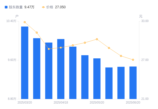 日期A股户数(户)流通A股户均持股数(股)户均持股市值(万元)2025-06-20946817668.3920.742025-06-10946197524.3020.802025-05-30944807535.3721.752025-05-20963507389.1222.332025-05-09969937340.1321.792025-04-30987707208.0821.112025-04-181003177096.9220.522025-04-10996017147.9420.532025-03-311005047083.7222.132025-03-201028946919.6222.73